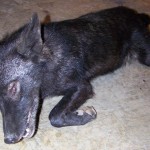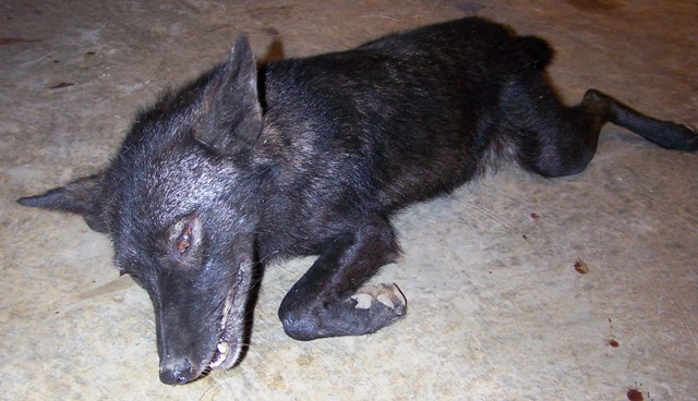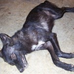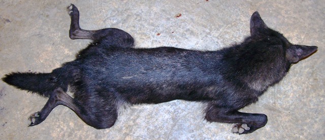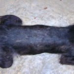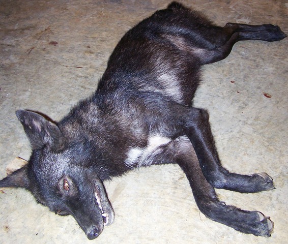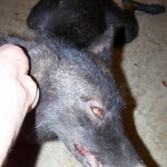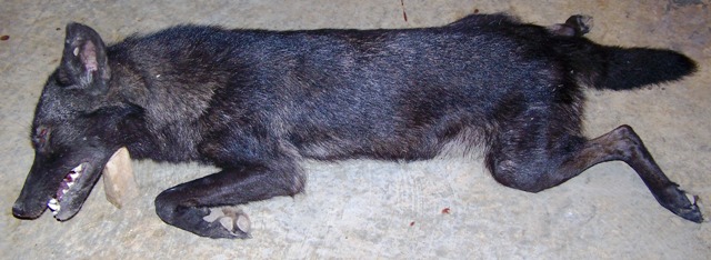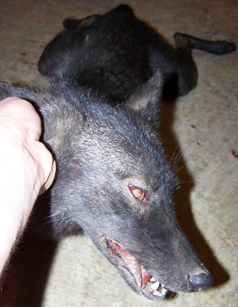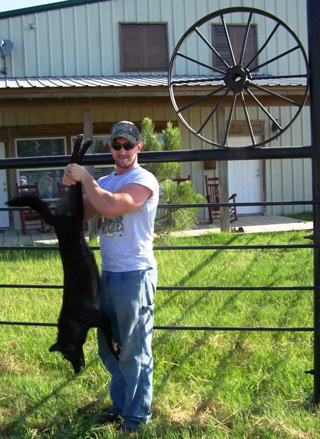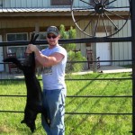 I was checking the snares I have put out on Estrella Ranch that I am the Wildlife Biologist for this morning around 7 am and I found two had been slipped and one was even twisted off and broken, but my next to last snare I checked held a rare prize. When I first got out of my truck I saw something black on the ground and thought “Great, I snared a small hog.” But, as I got closer I saw that it was some sort of black dog. Then, as I was reeling the thing through the fence I realized it was a black coyote and my excitement was over the top. I have seen only one other black coyote in the wild about 3 yrs. ago with one of my hunters from New York as it ran through a pasture about 500 yds. away. I’ve seen some mounted before but have never had the chance to shoot or catch one. This female, which weighed about 35 lbs. I’m guessing, had expired only a few hours before I got there because rigor had just set in and some of the blood was still warm and not coagulated as I capped it out. This is definitely going to be trophy to remember, I’ll be getting a full body mount and I’ll be doing the euro on the skull. Black coyotes are just about as rare as albino ones, so you can imagine how excited I am. A once in a lifetime opportunity for me. I have 12,500 acres to hunt if anyone is interested in booking a hunt with me for a predator, hog, deer, or just about whatever you can shoot. I also do the European mounts for my hunters and can even get your skulls camo dipped (check out my Facebook or myspace page for some pics of a camo dipped coyote and duck skull), so give me a shout if you need a place to hunt and see my website for prices.